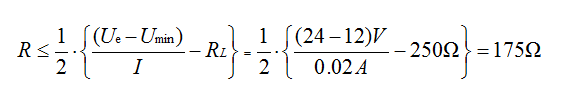 ? ? ? ? 根據(jù)這個(gè)公式,可以計(jì)算出在變送器處于低工作電壓時(shí),大的導(dǎo)線電阻。假設(shè):已知:Ue=24V,I=20mA,RL=250Ω,Umin=12V。求出r的大值為175Ω: